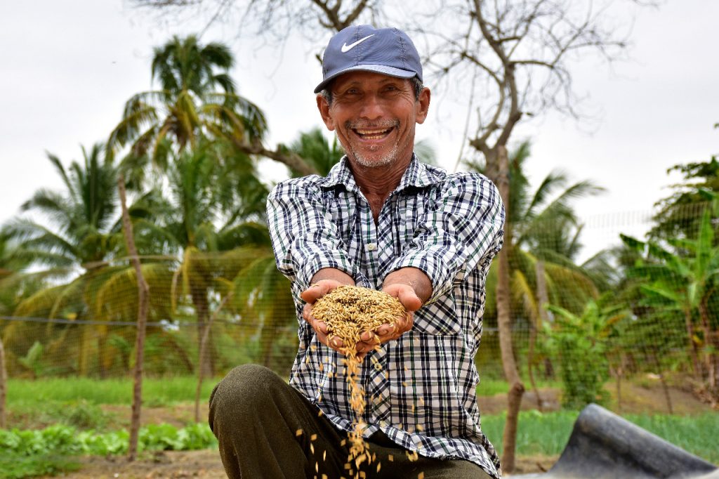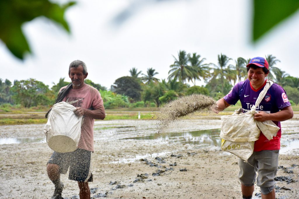 Nada detiene a Jorge Demera mientras cultiva arroz ecológico en Las Gilces. Ni siquiera el intenso sol que cubría con sus rayos esta comunidad de la parroquia Crucita, justo cuando él quitaba las malezas de su sembradío.
