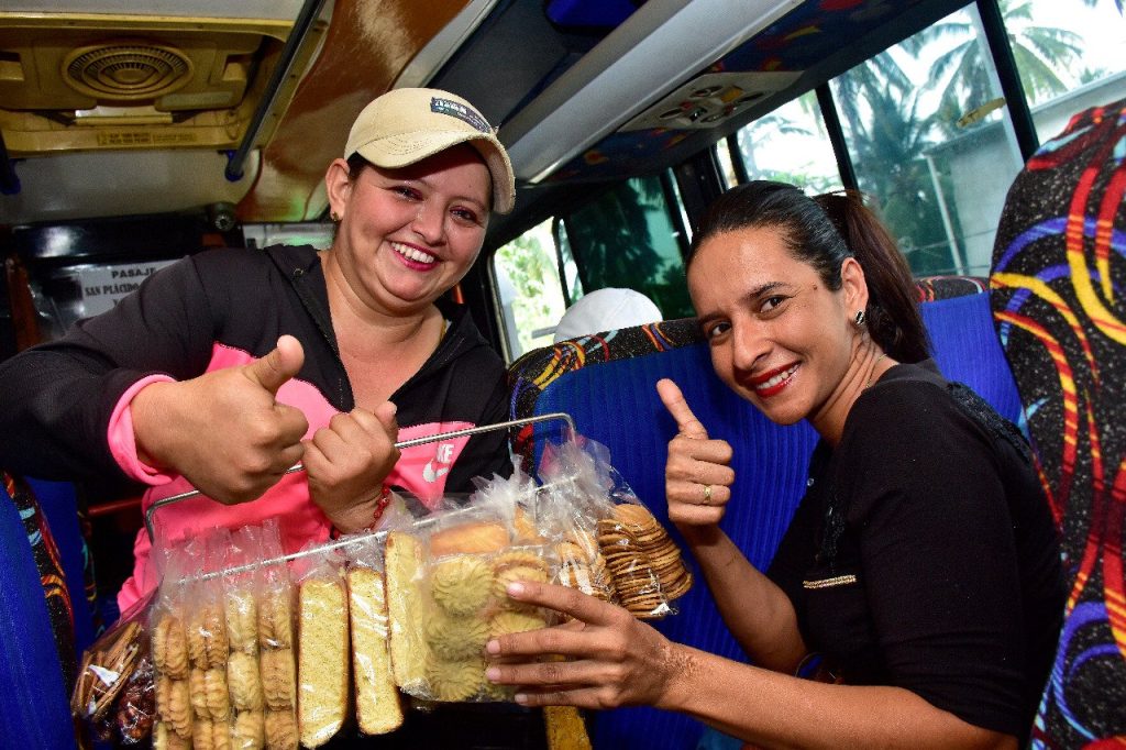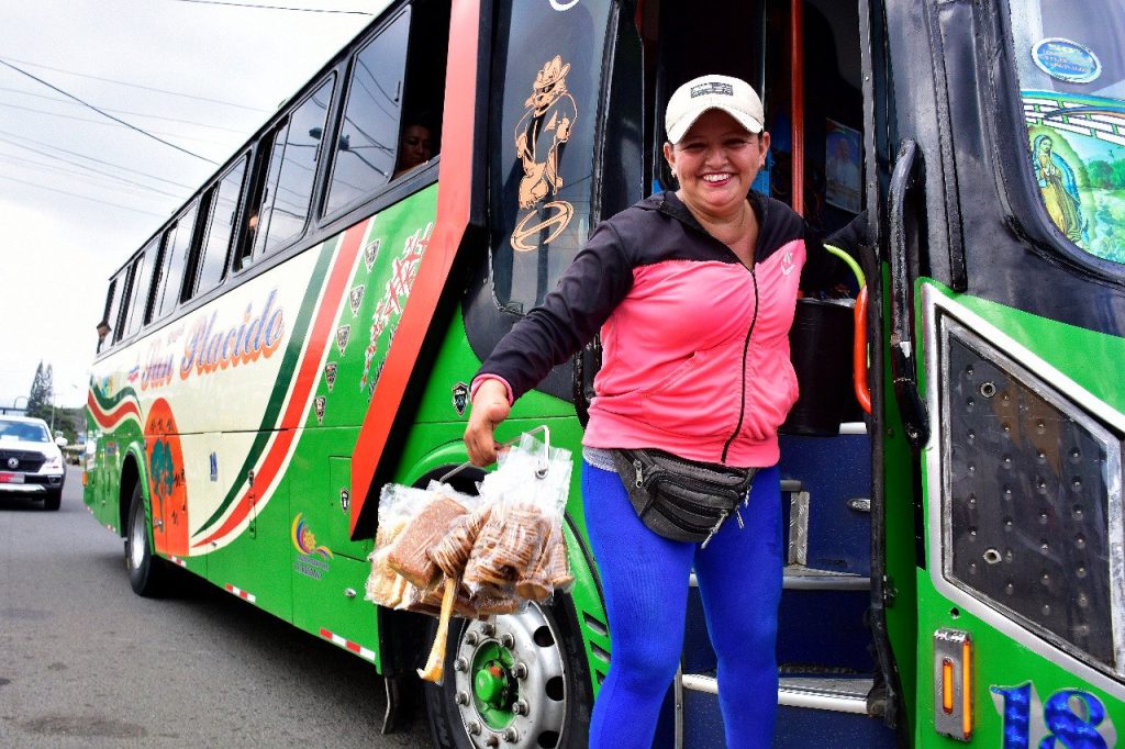Ella, de 36 años, viaja todos los días desde Calceta. Lo hace desde hace 8 años cuando sus hermanos le propusieron vender dulces y agua de coco en los buses. “En principio no quería porque me daba miedo y vergüenza, pero me decidí y me gustó”, manifestó mientras vendía una fundita de alfajores a una pasajera.